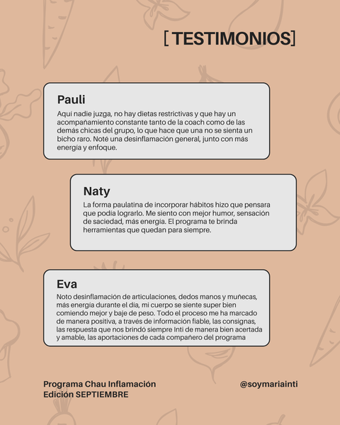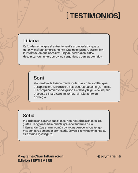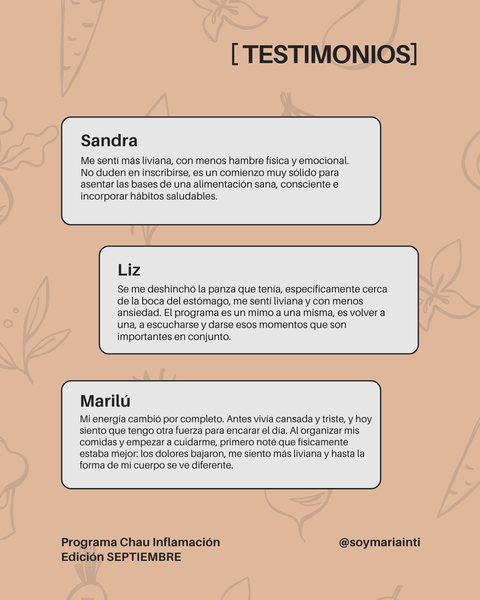La inflamación crónica de bajo grado es silenciosa, pero afecta tu energía, tu digestión, tu piel, tus hormonas y tu salud mental. Muchas veces estás inflamada y no lo sabés. O lo notas pero nada parece funcionar. Este programa es una puerta de entrada simple, guiada y realista para empezar a mejorar desde la alimentación y el autocuidado. Lo haremos acompañadas, en comunidad.